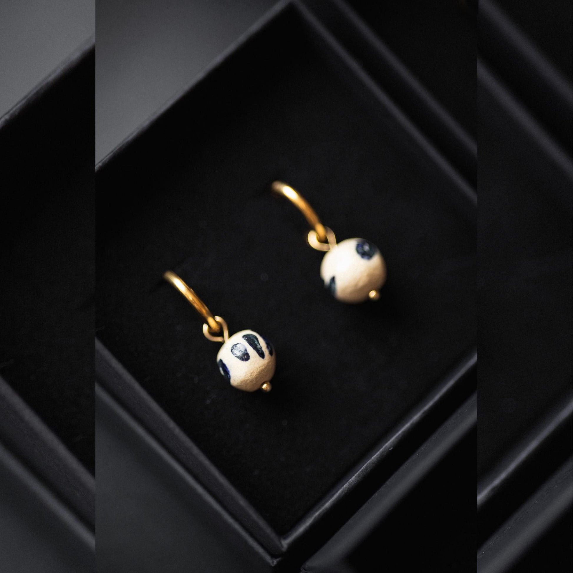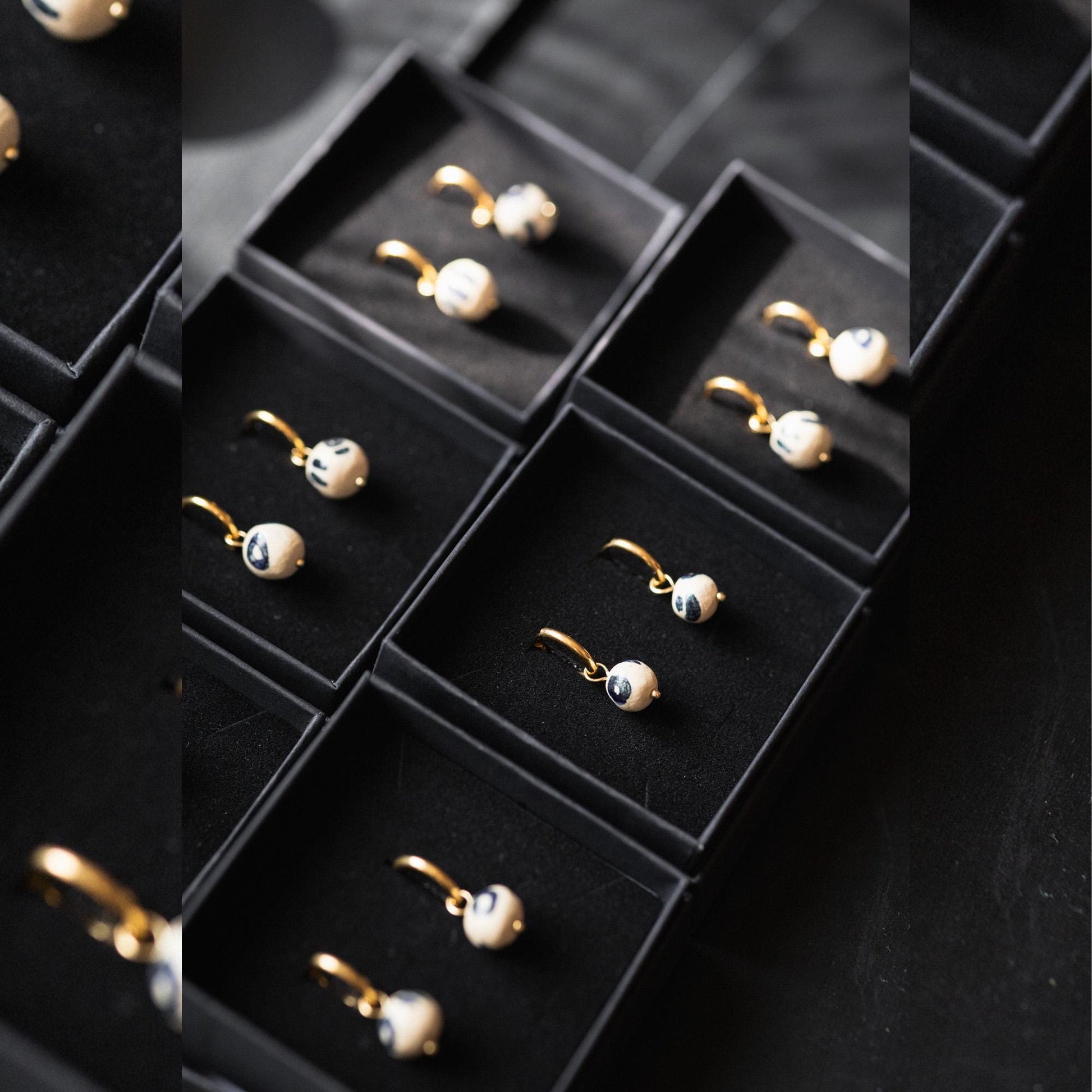 Each ceramic bead is handmade, hand-painted with cobalt oxide, glazed with transparent glaze and fired in a ceramic kiln. Due to the nature of this process, each bead is different - making each pair of these earrings unique and special.