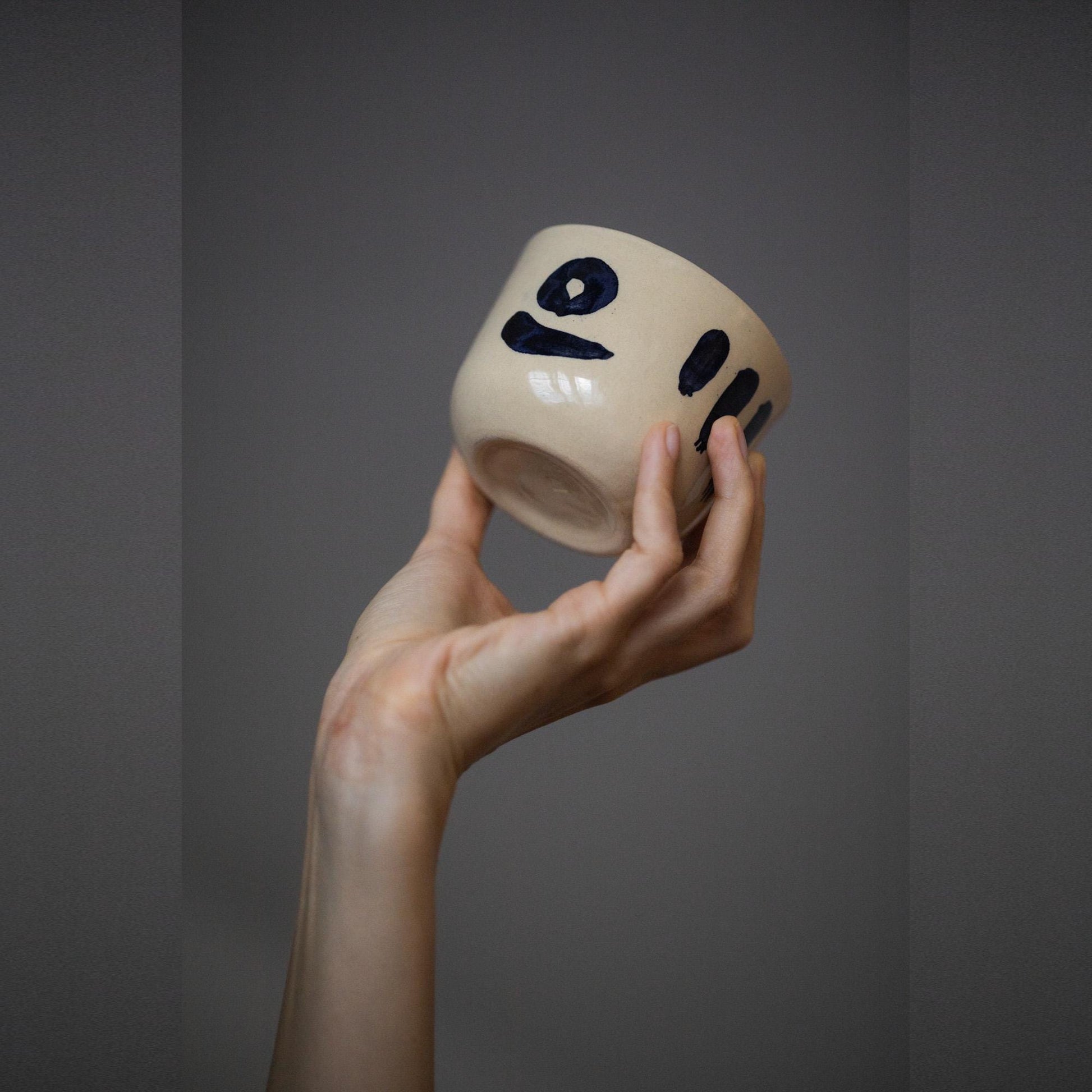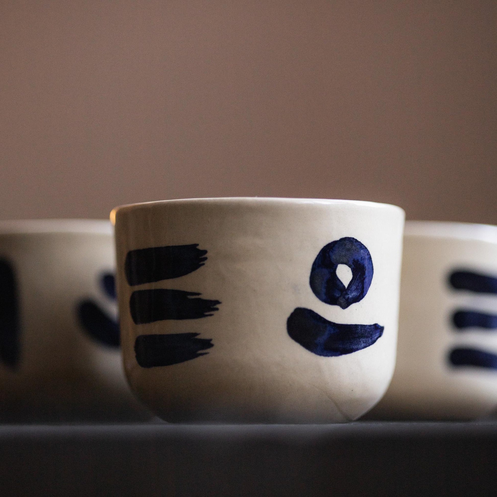 Handmade ceramic coffee cup, ideal for latte or tea. Beige earthenware clay, painted with cobalt oxide and glazed with food-safe glaze.